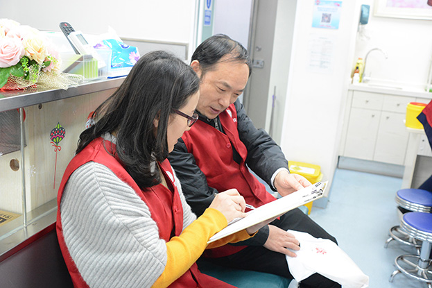 下午16時許,參加義務獻血的員工志愿者來到獻血地點,在工作人員的引導下,登記信息、測量血壓、抽血化驗,血液檢驗合格后開始無償獻血。